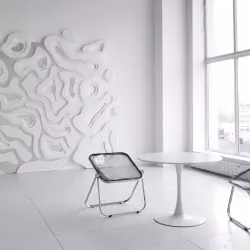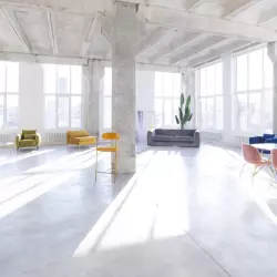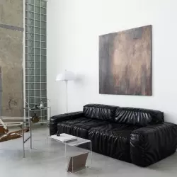 Минималистичный интерьер в индустриальной стилистике: бетон, металл, большие окна, дневной свет, дизайнерская мебель, огромная мобильная стена с окном, позволяющая легко трансформировать помещение.