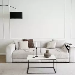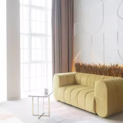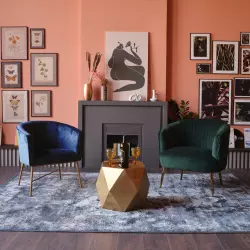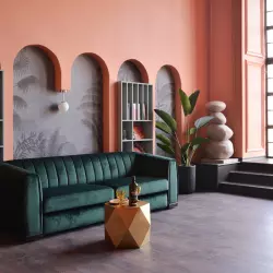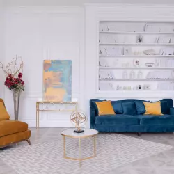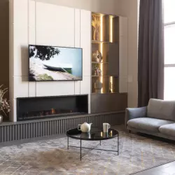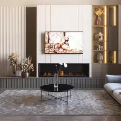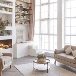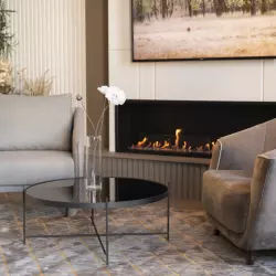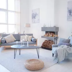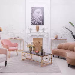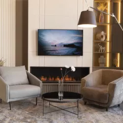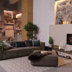 Стильная гостиная в стиле квартиры с диваном, камином и будуарной зоной.