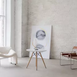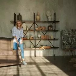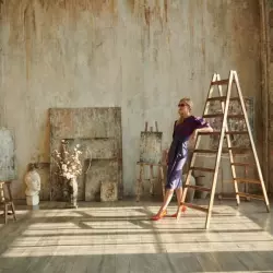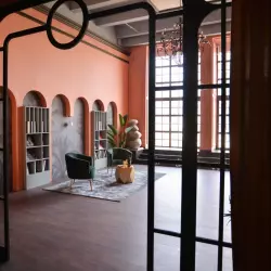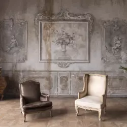 Зал в стиле мастерской художника. Невероятные фактурные стены, холсты, скульптуры, тканевый фон.