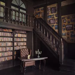 Зал в в стиле готической церкви. Витражи, фрески, алтарь, старинная мебель.