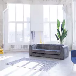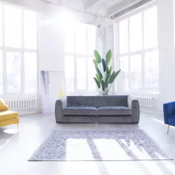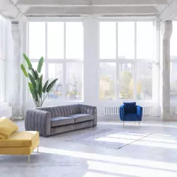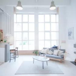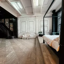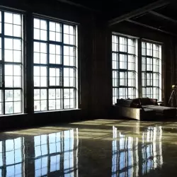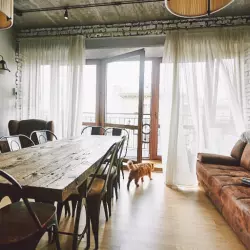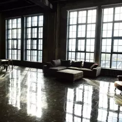 Классический просторный лофт с огромными окнами и большим разнообразием мебели.