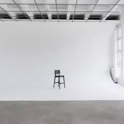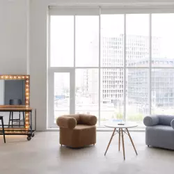 Недорогой зал без интерьера. В зале много кресел, стульев, столы, диван, рейл и всё необходимое для съёмок на цветных фонах.