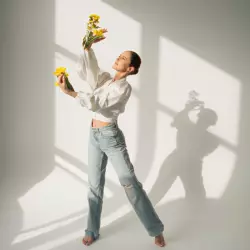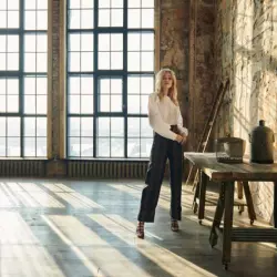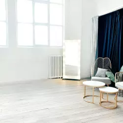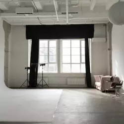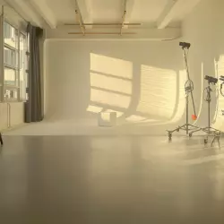 Белый зал с угловой циклорамой, огромные окна, прямой солнечный свет с утра до вечера.