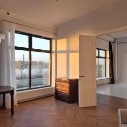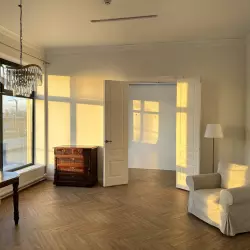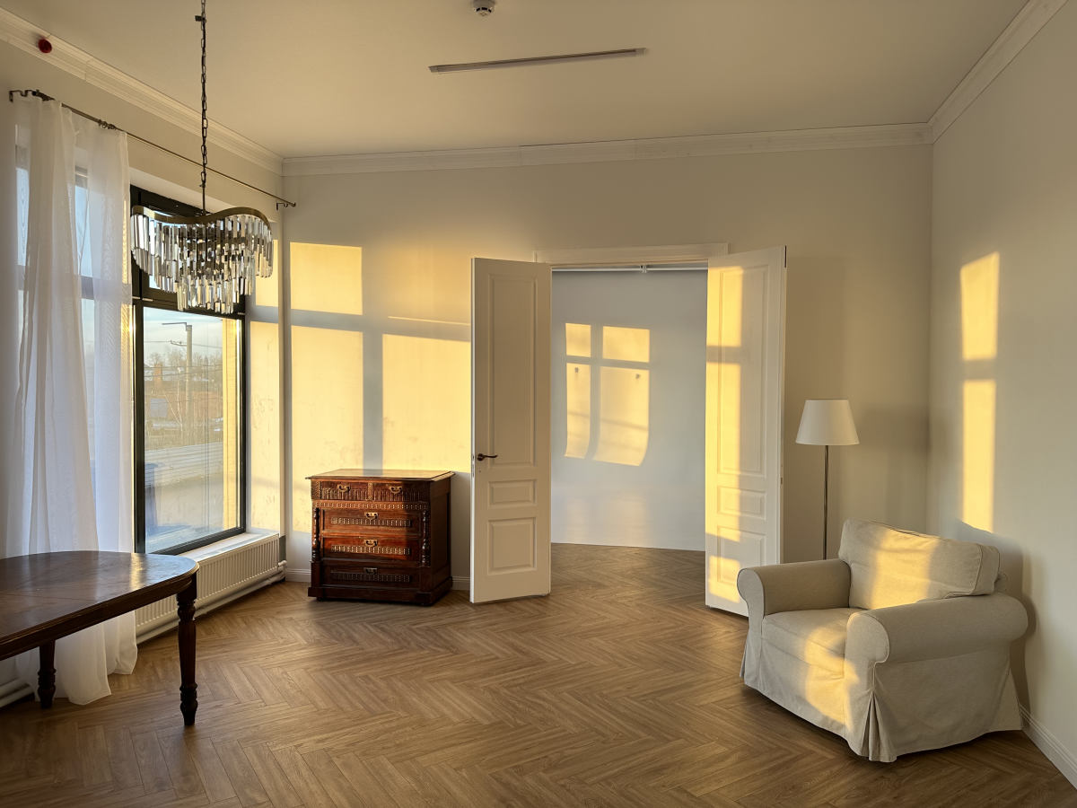 Два просторных зала с фактурными стенами и высокими потолками с большими окнами.