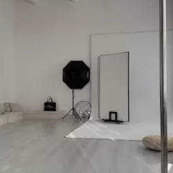 Белый зал площадью 70 кв.м. с белоснежной угловой циклорамой. Зал подойдет для профессиональной съемки каталогов одежды, обуви и аксессуаров, а также имиджевых и частных съемок в минималистичном стиле.
