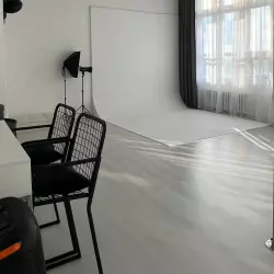 Новый эффектный съёмочный зал с фактурными бетонными стенами, деревянным полом, стильной мебелью, просторным гримерным местом и большой циклорамой размером 4х5 м.