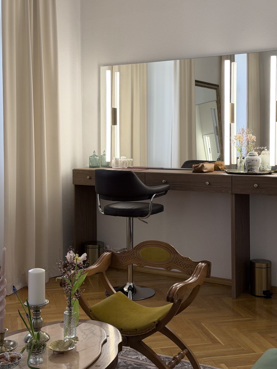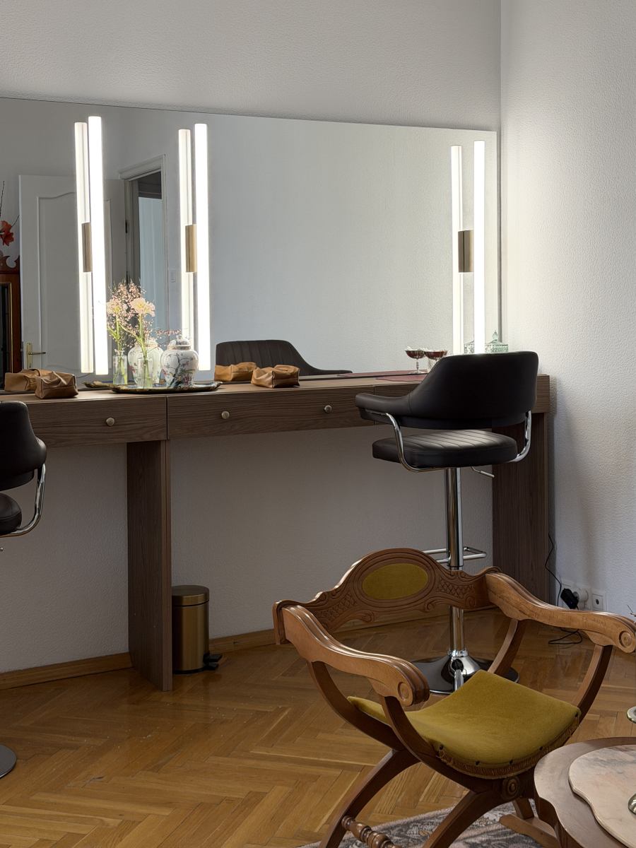 Гримерный стол с зеркалом + свет + стул с подъёмным механизмом + доступ к розеткам