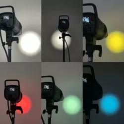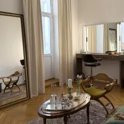 Серая циклорама, импульсный свет: четыре источника Profoto D1 500 Air, постоянный свет: два светодиодных источника Godox LITEMONS LA150Bi, кольцевая лампа, фоновая система, естественный свет, текстурная стена, интерьерная зона с трюмо, камерная гримёрка